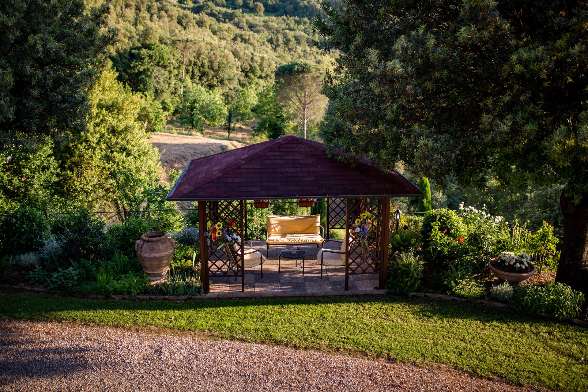 L’agriturismo è circondato da un bosco di proprietà di circa 7 ettari e da un oliveto di circa 3 ettari. Il giardino dell’agriturismo è interamente recintato e pieno di zone d’ombra grazie ad una ricca vegetazione tra cui cipressi, lecci e bellissime querce. Nel giardino si trova una zona dedicata ai bambini con vari giochi, amache e panchine, un gazebo per la lettura e momenti di relax, un gazebo con tavolo da pranzo con vista sulla vallata, un barbecue per preparare gustose grigliate, un piccolo orto per assaporare il vero gusto delle verdure fresche e sparse tra le aiuole ci sono tante essenze aromatiche per preparare eccellenti piatti.